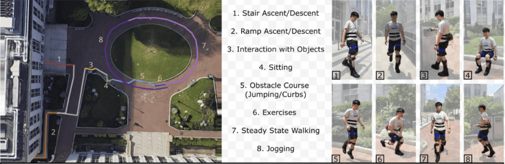 For the online evaluation, a novel user performed various actions on an outdoor course (Image 2) while two controllers ran in parallel on the ankle exoskeleton: a variable-speed ML controller (also developed by the Shepherd lab for walking and jogging) and the uncertainty estimator. The team measured how accurately the uncertainty estimator identified when to disengage the ML controller based on the user’s actions. Results showed high accuracy across most tasks, though the system needed improvement in two areas: transitions between in- and out-of-distribution tasks, and navigation of less steep stairs. Overall, the team successfully created an uncertainty-aware framework that enables ankle exoskeletons to operate safely across diverse scenarios by automatically disengaging when encountering unfamiliar movements.